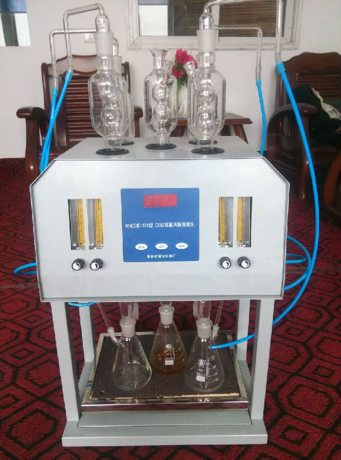 YHCOD-100型高氯COD消解器遵循了遵循中华人民共和国环境保护行业标准—高氯废水化学需氧量的测定氯气校正法国家标准分析方法规范地制定了水质化学需氧量COD(Cr)的测定步骤,严格地规定了方法的加热消解时间,保证了回流加热微沸2小时的消解操作,试剂溶液的配制和加入量都和GB法一致,确保可靠精确的分析结果。 YHCOD-100型高氯COD消解器主要由机身、回流管、风扇、电炉板等4大部分组成,采用微机技术进行定时控制加热电炉板和风扇,可对5个锥形瓶回流装置同时进行加热。